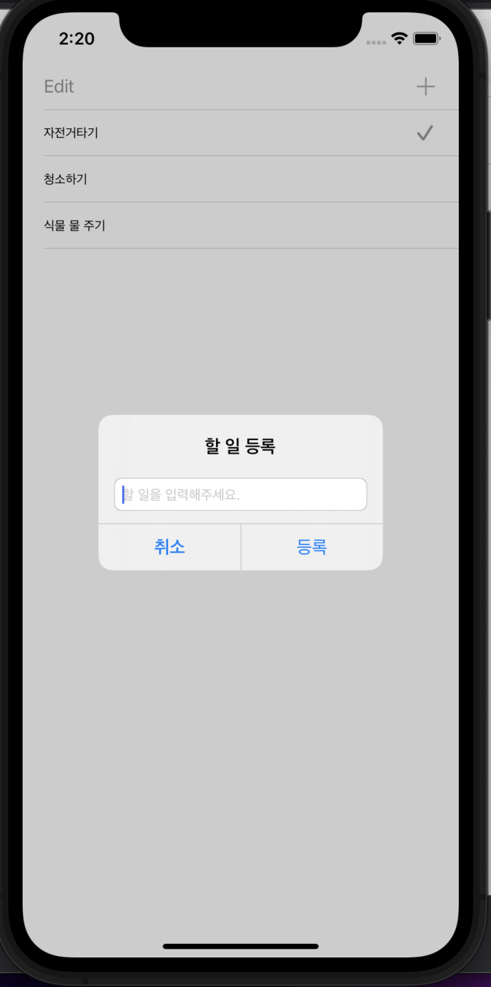 플러스버튼을 눌러서 UIAlertController 를 호출해서 Alert창 안에 TextField를 추가해
